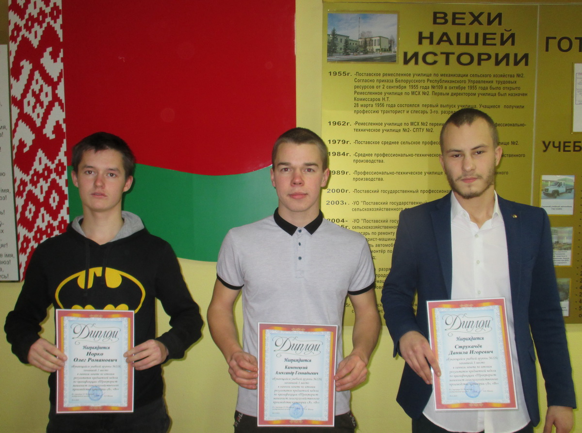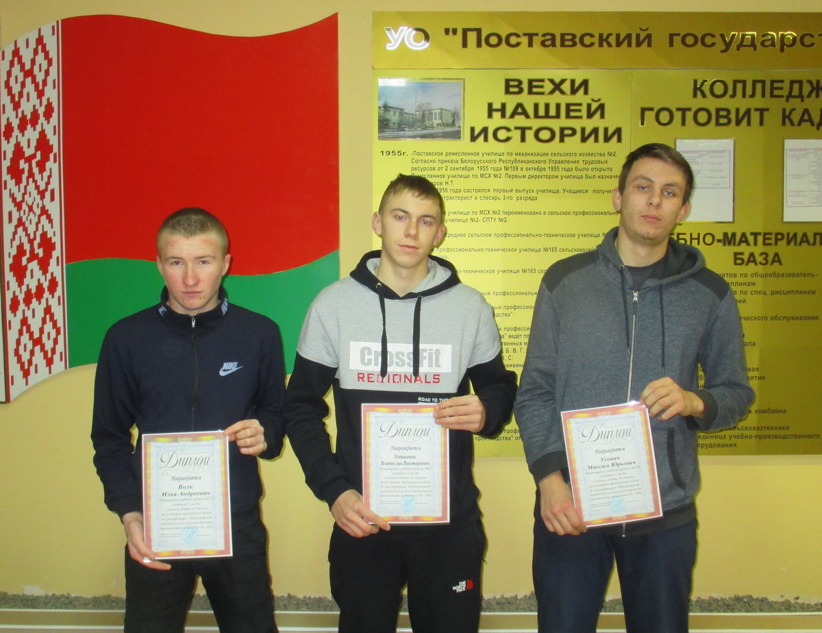 С 26 по 30 ноября в колледже проходила предметная неделя по квалификации "Тракторист-машинист с.х. производства категории "А", "В"", в рамках которой проходили следующие мероприятия: теоретический конкурс (решение билетов по ПДД и устройству тракторов), практический конкурс (выполнение заданных элементов на трактородроме), игра "Брейн-ринг". По итогам всех испытаний победителями стали: Волк Илья (Диплом 1 степени), Ходанёнок Владислав (Диплом 2 степени), Усович Максим (Диплом 3 степени).